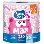 Háromrétegű, 250 lapos univerzális törlőpapír cellulózból. A Bunny Soft MAX erős, puha és kiváló nedvszívó képességű, így ideális háztartási és professzionális felhasználásra. 3 × 18 g/m² súlyú papír, 1 tekercs/csomag, 6 tekercs/karton.