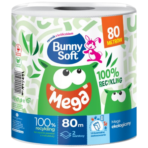 A Bunny Soft MEGA ECO egy 100 méter hosszú, 1 rétegű, 100% újrahasznosított papírból készült univerzális törlőpapír, amelyet a gyártó a nagy igénybevételű, mindennapi feladatokra tervezett. A papír fehér, jó nedvszívó képességű, és a 38 g/m² súlynak köszönhetően erősebb, mint a legtöbb hagyományos 1 rétegű törlőpapír.