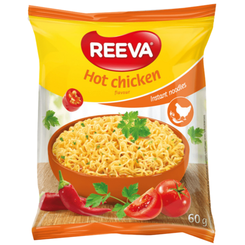 A Reeva instant tésztaleves csípős csirkés ízben egy gyorsan elkészíthető, fűszeres, csípős aromájú zacskós leves, amely ideális gyors étkezésekhez.